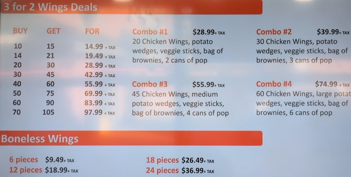 60 chicken wings, 1 large order of potato wedges, veggie sticks, bag of brownies, and 6 cans of pop.